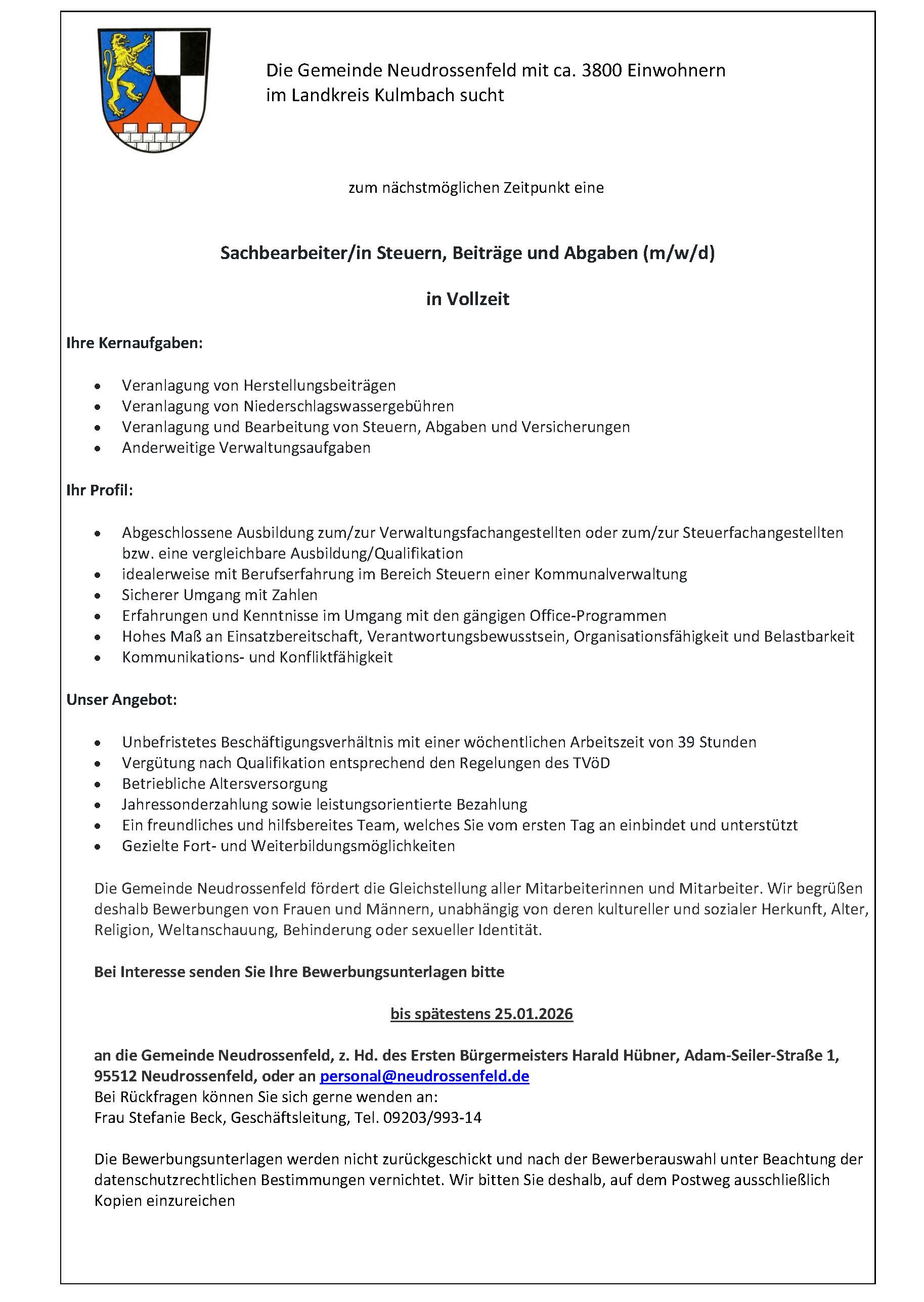 Die Gemeinde Neudrossenfeld sucht eine/n Sachbearbeiter/in Steuern, Beiträge und Abgaben (m/w/d) in Vollzeit